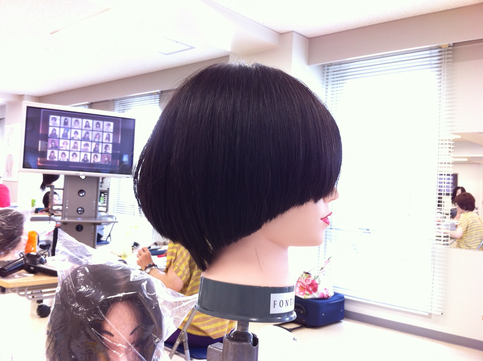 いつもの感じで講師の井上さんのウィッグカット、ハイスピードで切り進む。